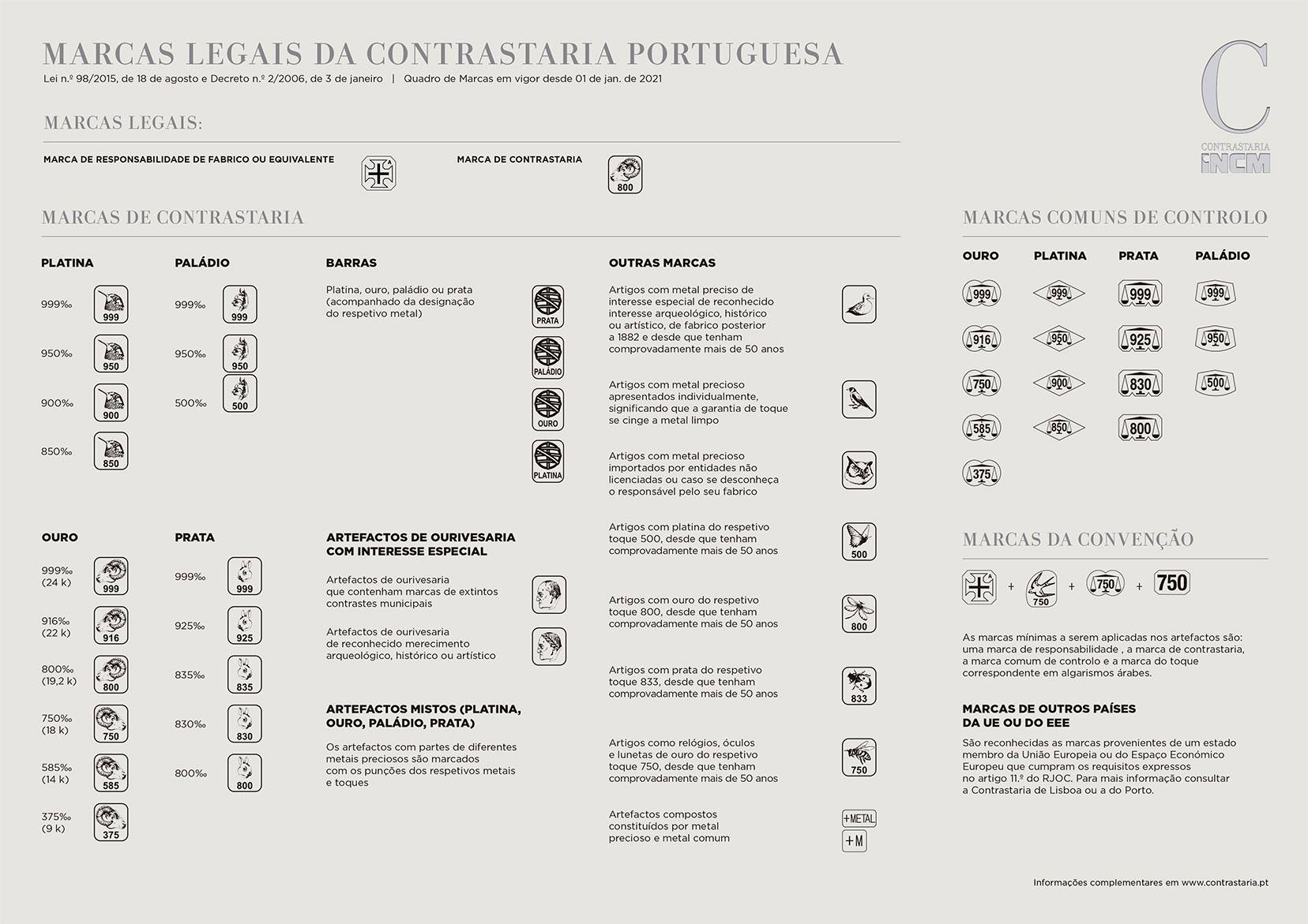 Portugal faz parte do grupo de países da União Europeia que oferece os mais elevados padrões de garantia de qualidade aos consumidores de artefactos de metais preciosos. De acordo com as leis europeias, todos os produtos de prata, ouro e platina devem ser contrastados e o contraste deve incluir o tipo de metal precioso e a sua pureza. As marcas de contraste em Portugal visam garantir de forma independente os toques legais da ourivesaria, responsabilizando não só quem faz o artefacto, mas também quem controlou o seu toque, assegurando isenção.